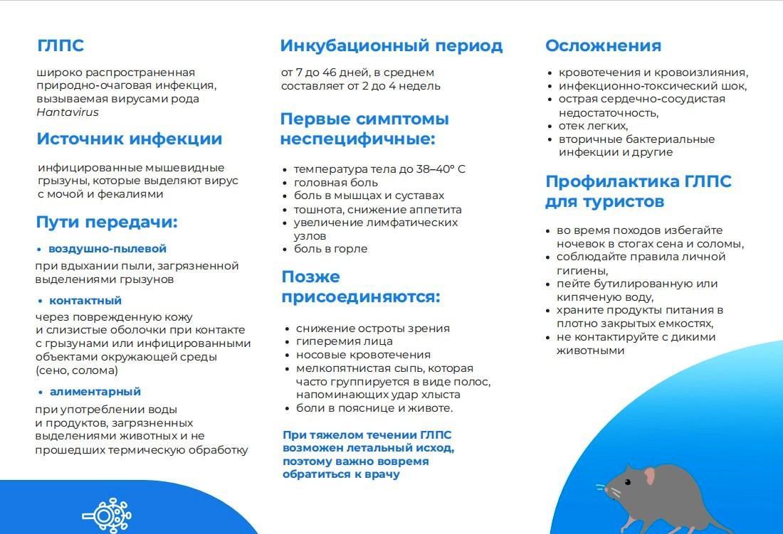 При появлении признаков заболевания после проведения работ, связанных с пылеобразованием, обратитесь за медицинской помощью и сообщите о фактах возможного контакта с мышевидными грызунами.
